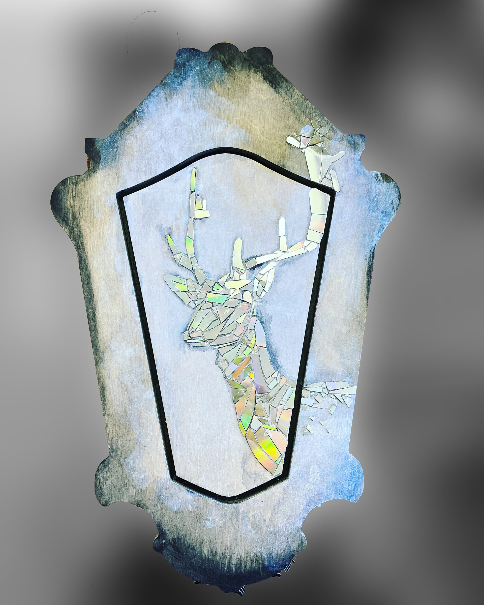 2023, acrylic and CD mosaic on fir panel, 12x19”, SOLD