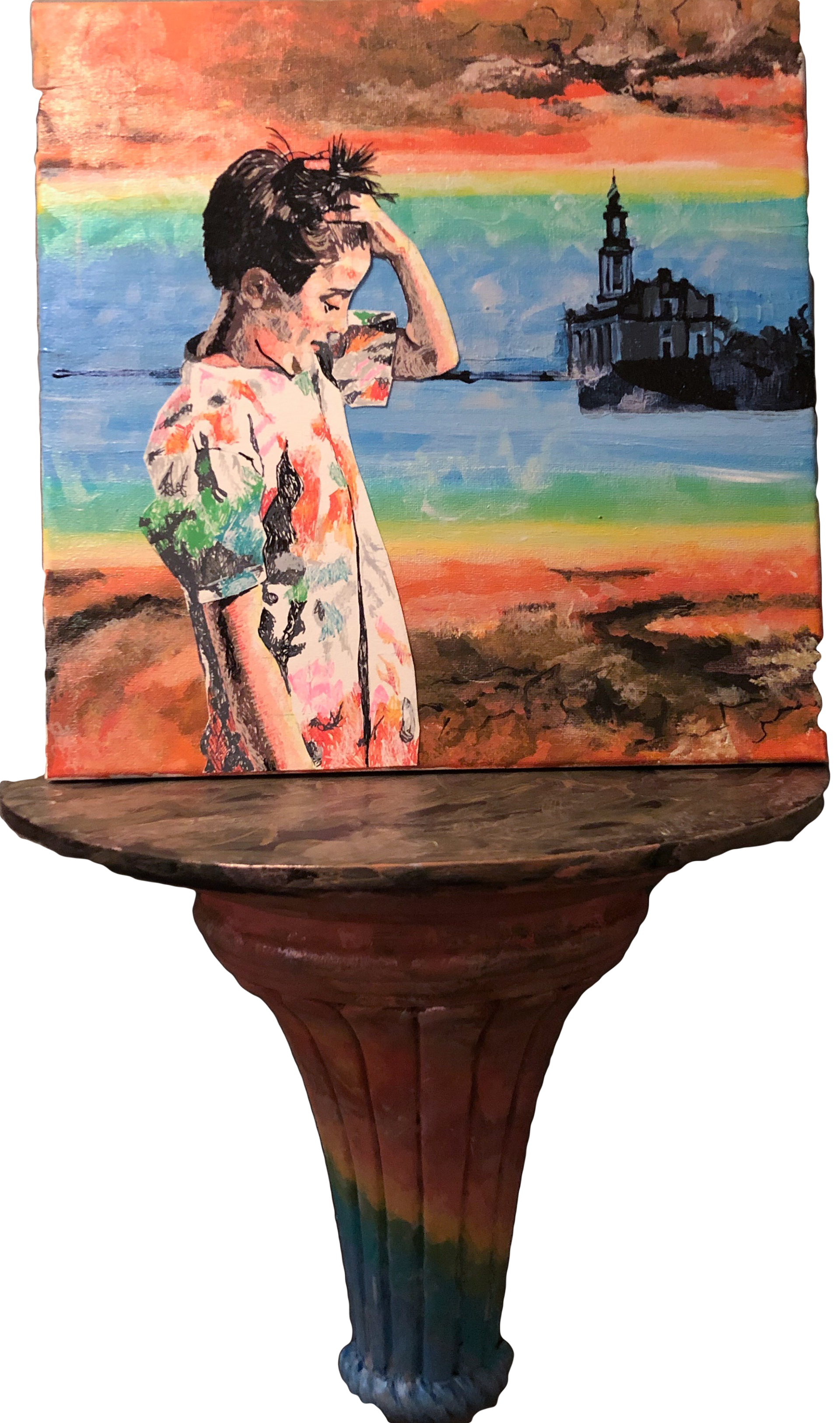 2020, acrylic paint and water-based marker, 14 x 14" canvas, 15 X 12" antique shelf