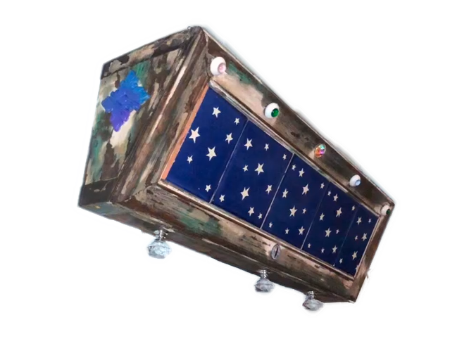 2019, antique wooden box covered with cobalt blue tiles from Mexico, glass knobs at the base, and glass eye across the top, .7.5 X 22"