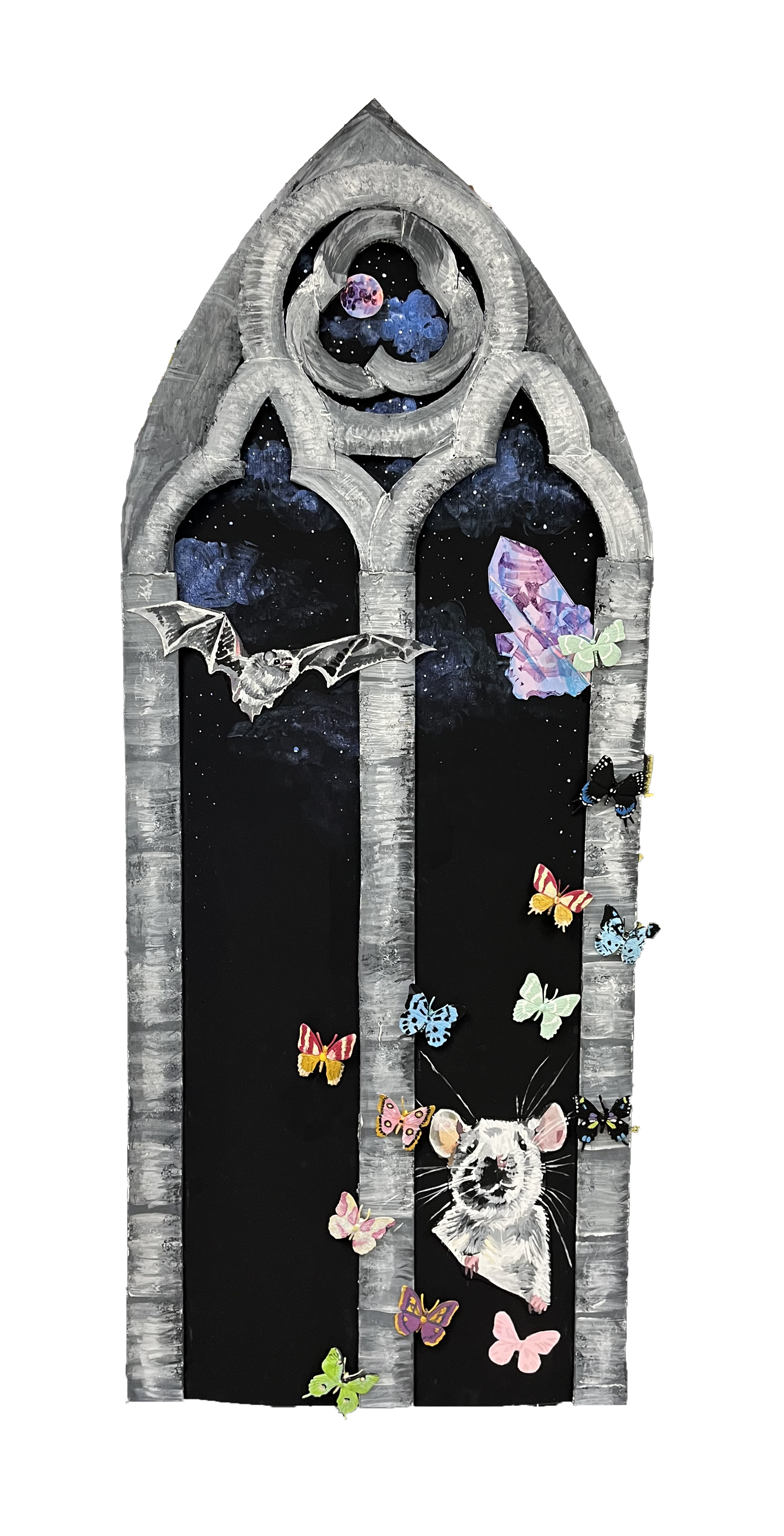 2025, acrylic, coroplast board, plastic butterflies, plastic, mixed media board, on canvas, 38 X 15.5", $600