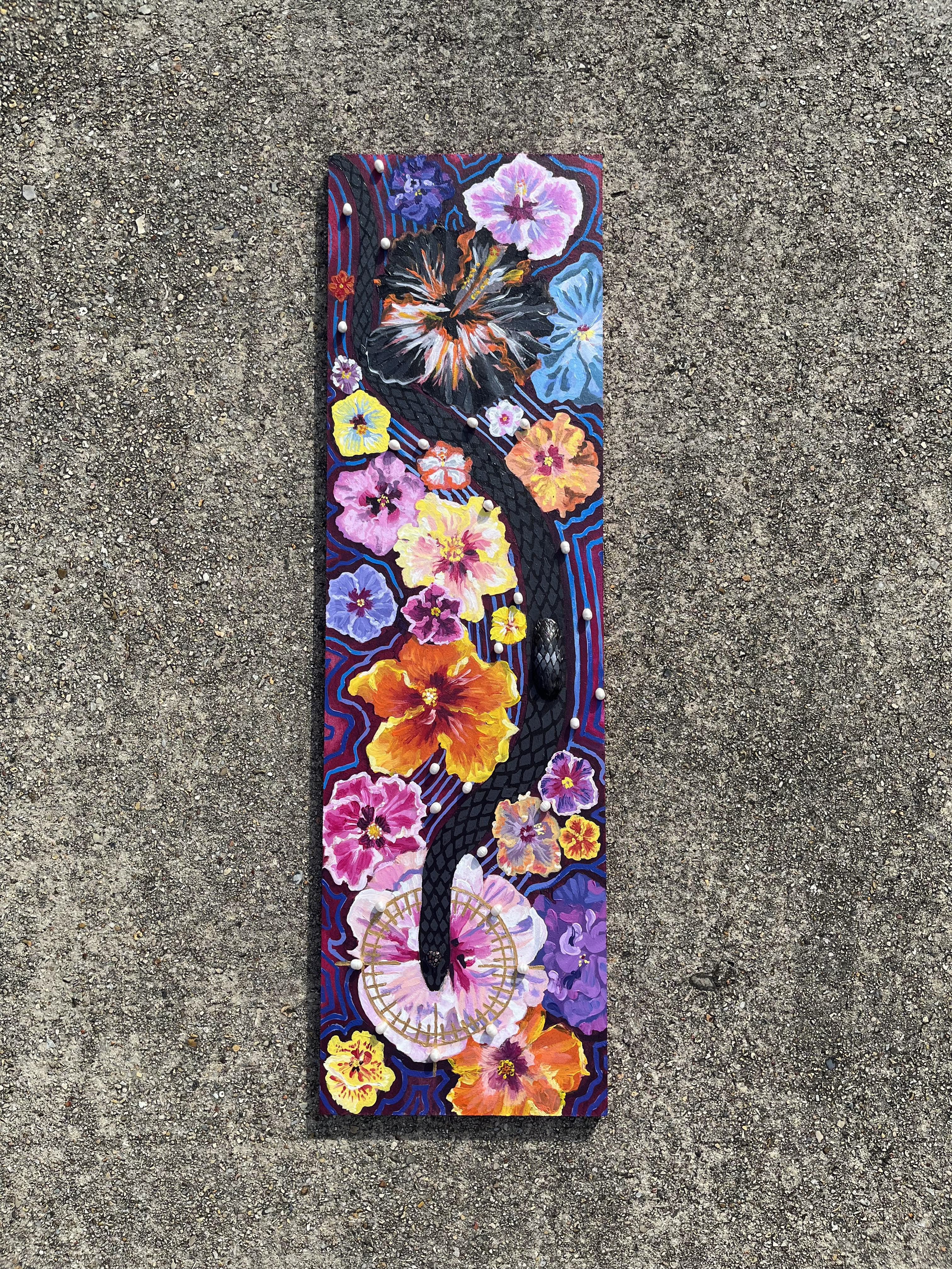 Snake Amongst The Flowers, 2025, acrylic, epoxy clay, and freshwater pearls on MDF board, $600