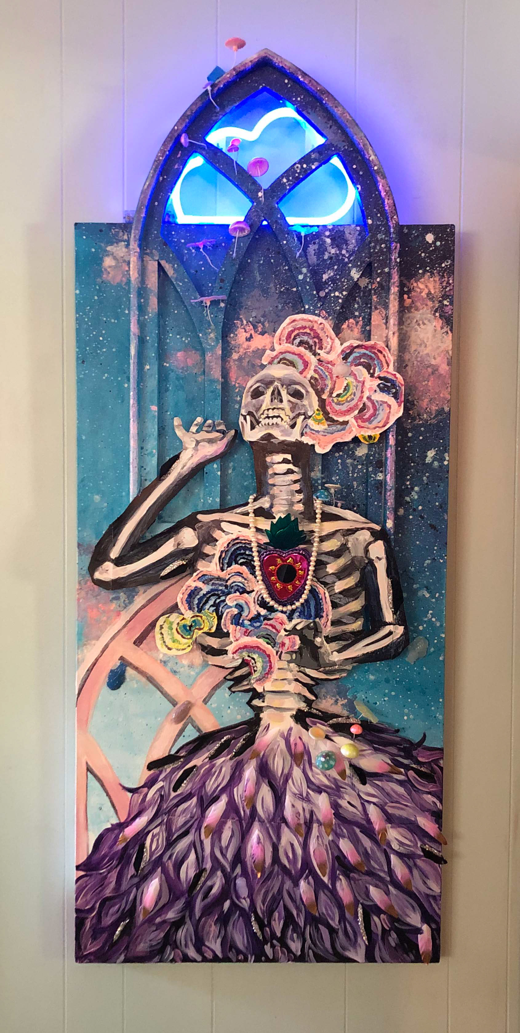 2021, Acrylic, prefabricated wooden gothic arch, glue, canvas, multimedia board, carved stone, plastic mushrooms, 24” x 58”